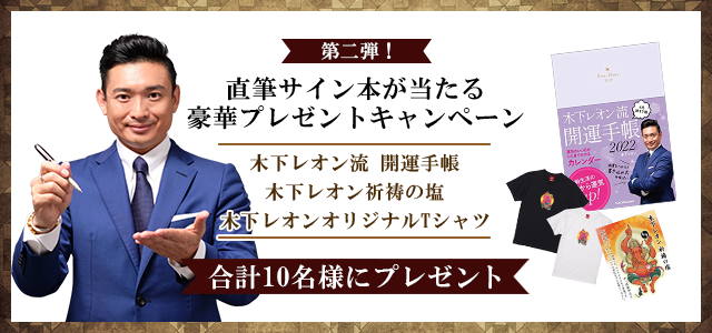 対象の鑑定をご購入された方へ、木下レオンの直筆サイン入り最新書籍「木下レオン流開運手帳」、「木下レオン祈祷の塩」「木下レオン公式ガネーシャTシャツ」を抽選で合計10名様にプレゼントいたします。ぜひこの機会に『木下レオンの占い』をご利用ください。