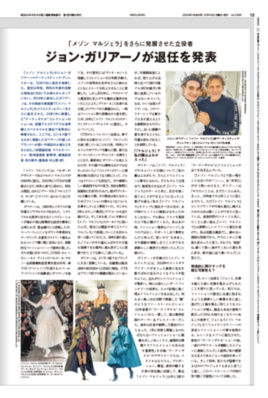 そして、「メゾン マルジェラ(MAISON MARGIELA)」のアーティスティック・ディレクターを退任した、ジョン・ガリアーノの功績も振り返ります。クリエイションとビジネスにいかに貢献したかを、米「WWD」の本人への貴重な取材を交えながら紹介します。