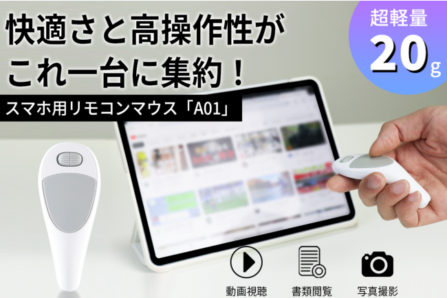 「A01」は、スマホやタブレットなどに触れずに操作できるリモコンマウスです。