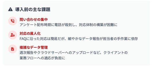 クライアントは、大手自動車メーカーのアンケート事務局業務において、アンケート配布時期に問い合わせが集中し、人員確保や対応品質の維持に課題を抱えていました。