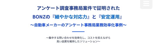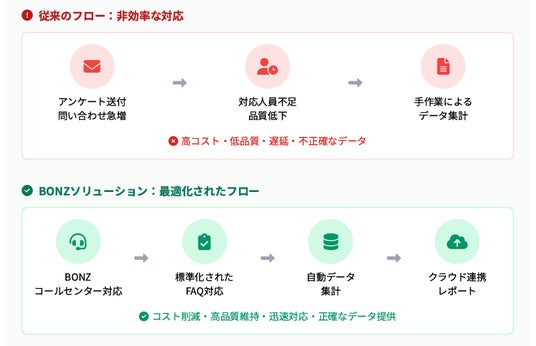 株式会社ボンズコミュニケーション(本社:神奈川県横浜市、代表取締役社長:山本篤史)は、この度、顧客満足度調査を提供する企業(以下、クライアント)のアンケート業務において、問い合わせ対応の効率化と品質維持を実現した事例を発表しました。