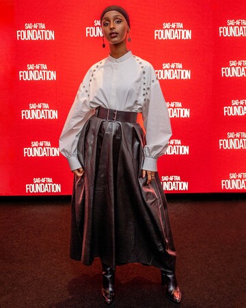 10月25日にニューヨークで開催されたSAG-AFTRA Foundation 主催の「Dangerous Liaisons」スクリーニングで、コサル・アリが、2023年春夏プレコレクションよりハーネス状にあしらったシルバーメタルアイレットのディテールが特徴的なコクーンシャツ、ブラックレザーのバルーンスカートにパンクニーハイブーツを着用して登場しました。