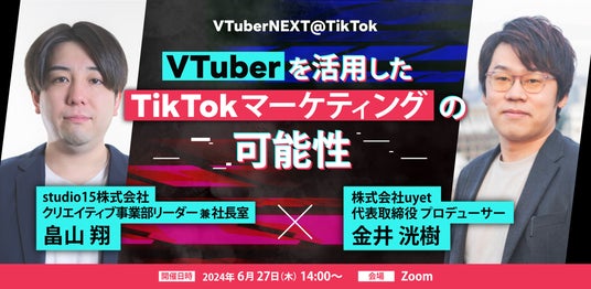 VTuber、IPコンテンツを通して日本と世界で新たな流通を生み出す“IPコンテンツの総合商社”株式会社uyet(ユエット)(本社:東京都渋谷区、代表取締役:金井洸樹・梶田大樹)は、2024年6月27日(木)14:00よりstudio15株式会社様と共催でウェビナー「VTuberを活用したTikTokマーケティングの可能性」を開催します。本ウェビナーでは無料でお申し込みが可能となっており、"TikTokマーケティング"を実施してみたい、またVTuberを活用してみたい企業・自治体の担当者様に向けて、VTuberを活用した"TikTokマーケティング"について解説させていただきます。