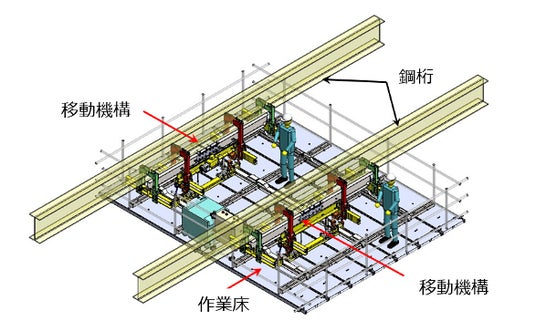 「ムーバルデッキ」のアームは開閉するため、添接板や補剛材などの支障物がある場合には、アームを開いて移動させることにより回避できます。