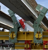 橋梁や高速道路のリニューアル、点検工事において、作業用の吊り足場を安全かつ効率的に組立・解体できる移動足場です。「ムーバルデッキ」は移動機構と作業床で構成されており、鋼桁の下フランジを把持(はじ)するアームによって、橋梁にぶら下がる形で懸吊(けんちょう)され、レール梁(緑アームで懸吊)と作業床(赤アームで懸吊)の支持を油圧により交互に入れ替え、アームをスライドさせることにより移動します(尺取り方式)。