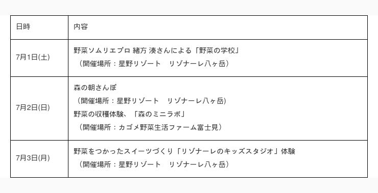 星野リゾートが運営し、地域や季節ならではの体験ができるリゾートホテル「星野リゾート リゾナーレ」と、カゴメ株式会社は7月1日(土)~7月3日(月)、自然をおいしく、楽しく学ぶ「リゾナーレとカゴメの食育」イベントを共同で開催しました。
