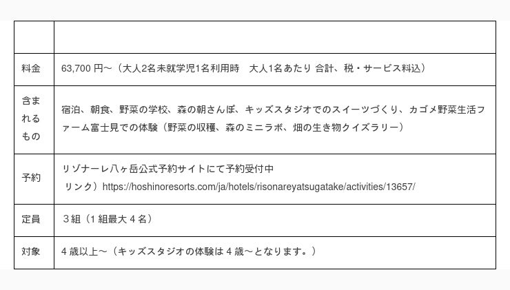 最年少野菜ソムリエプロ 緒方 湊さんによる野菜や食について楽しく考える授業「野菜の学校」の他、野菜の収穫体験や森が水をきれいにする仕組みを知る「森のミニラボ」、星野リゾート リゾナーレのキッズスタジオで野菜を使ったスイーツづくりなど本プラン限定の体験を提供しました。