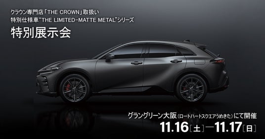 トヨタ自動車株式会社は、2024年11月16日(土)・17日(日)の2日間、クラウン専門店「THE CROWN」取扱い特別仕様車のTHE LIMITED - MATTE METALシリーズの展示イベント「CROWN STYLE CARAVAN -THE LIMITED- in OSAKA」の追加開催を決定いたしました。大阪・グラングリーン大阪(ロートハートスクエアうめきた)で開催いたします。