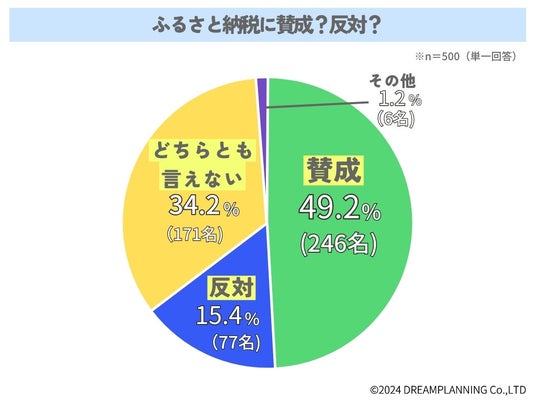 ふるさと納税について賛否を調査した結果、賛成が5割弱、反対が2割弱、そしてどちらとも言えない方が約1/3となっていました。