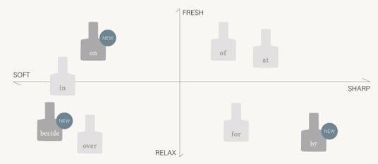 選ぶ香りによって異なる雰囲気や気分を纏うことができるように、関係性をつなぎ、ニュアンスを演出する役割として「前置詞」と「香り」を重ねています。