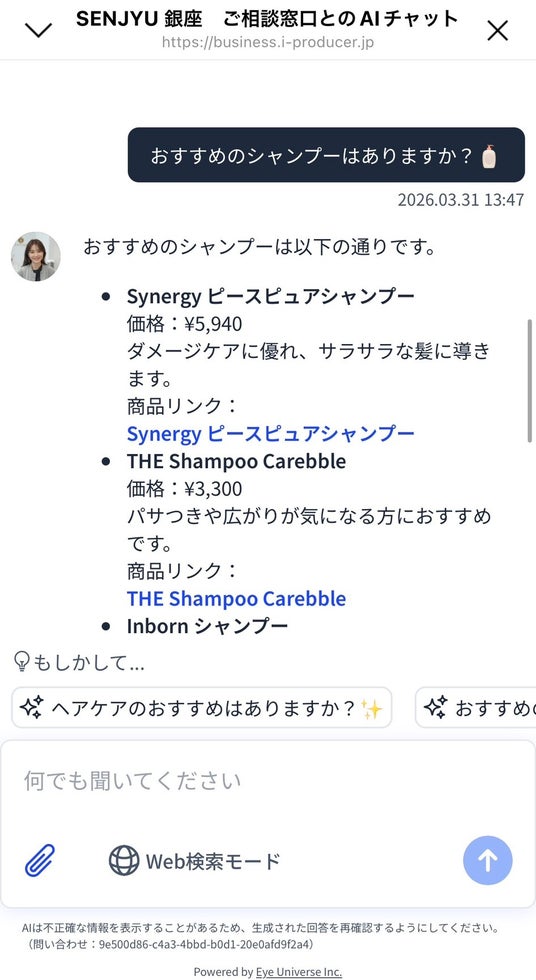 株式会社EyeUniverse(所在地:東京都港区、代表取締役:森越道大、以下「当社」)は、美容業界向けAIサービス「iProducer Studio」において、導入サロンによる月100件超の相談対応代行という突出した実績を確認しました。導入サロンの多くは、顧客対応や社内業務といった一つの領域からAI活用をスタートしています。しかし、今回実績を公開するサロンは、6つの用途を同時に使いこなしており、特に注目される実績です。(iProducer Studio導入550法人を対象に調査・2026年3月時点・当社調べ)