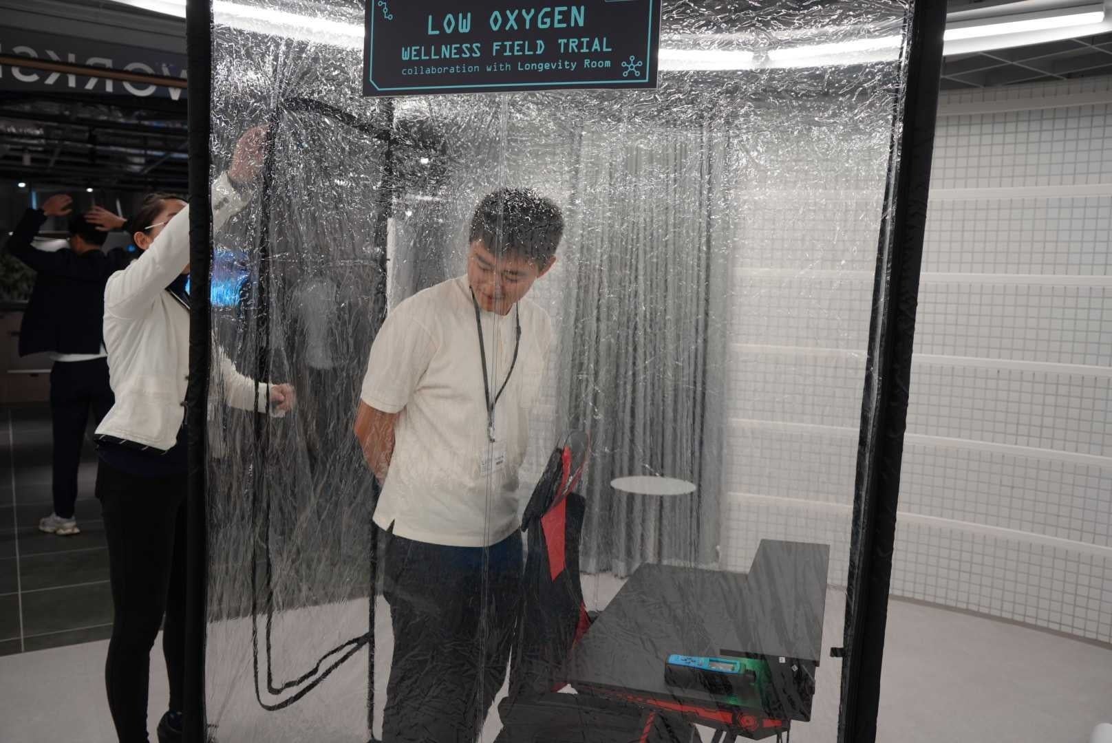当日は、研究者、投資家などのステークホルダーが参加し、実際に低酸素空間が体験できる環境を設営。参加者は血糖値測定デモンストレーションなどを通じ、低酸素環境下で受ける影響を一部体感しつつ、可能性についての理解を深めました。