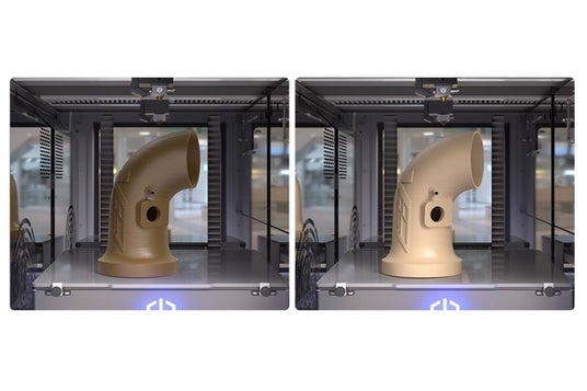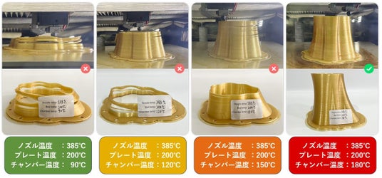 PEEK-250は、200°Cまでの昇温が可能な高温チャンバーを搭載し、高温環境下での造形が必要なPEEKやPEIなどの高性能材料に必要な機能を備えています。特に、PEI材料の造形においては材料の接着をよくし成形内部応力を低減させるため、高い温度環境下での造形が必要になります。PEEK-250では、推奨される180℃のチャンバー温度下での造形が可能になり、より安定した造形を行えます。