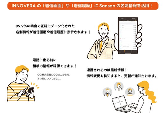 Sansanは、名刺やメールといった接点から得られる情報を99.9%の精度で正確にデータ化し、全社での一元管理を可能にする営業DXサービスです。公開されている組織改変の情報などを基に、Sansanに登録された人物の役職や所属部署などを自動で更新する機能も備えています。今回の連携により、Sansanに蓄積された顧客情報(氏名・会社名)がINNOVERAの電話帳には入力せずとも、着信画面や通話履歴に表示されるようになりました。これにより電話に出る前に、相手の最新情報を確認し、スムーズな業務対応を行うことが可能となります。