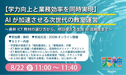 「講師の役割はAIに代替されるのか?」――。生成AIの進化は、教育現場に希望と同時に根源的な問いを突きつけています。学習塾向けのICT教材「天神」を企画・開発・販売する株式会社タオ(本社:滋賀県草津市、代表取締役社長:黒澤慶昭)は、学習塾のAI指導の現状、日々の業務を効率化する具体的な「AI時短テクニック」までを網羅した無料オンラインセミナーを、2025年8月22日(金)に開催します。
