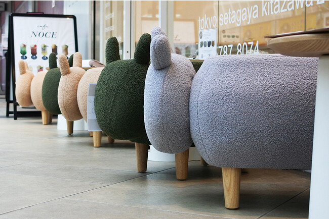 テラス席のスツールを一新し、新作家具のゴートスツールに入れ替えました。テディファブリックと木製の脚で北欧風の雰囲気を感じさせるヤギのスツールは、グリーン、ブラック、ライトブラウン、グレーの4色展開になっています。どれもかわいらしく思わず全色揃えたくなってしまいそうです。Cafe NOCEではそんなゴートスツールを各色2匹ずつ、計8匹を展示・販売しています。もちろん、実際に座ってお食事をしていただけます。