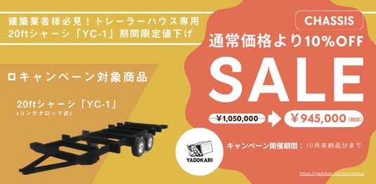 YADOKARI株式会社(代表取締役上杉勢太・さわだいっせい、以下YADOKARI)は、トレーラーハウス専用のオリジナルシャーシを10%OFFのお手頃価格でご購入いただけるキャンペーンを開催します!