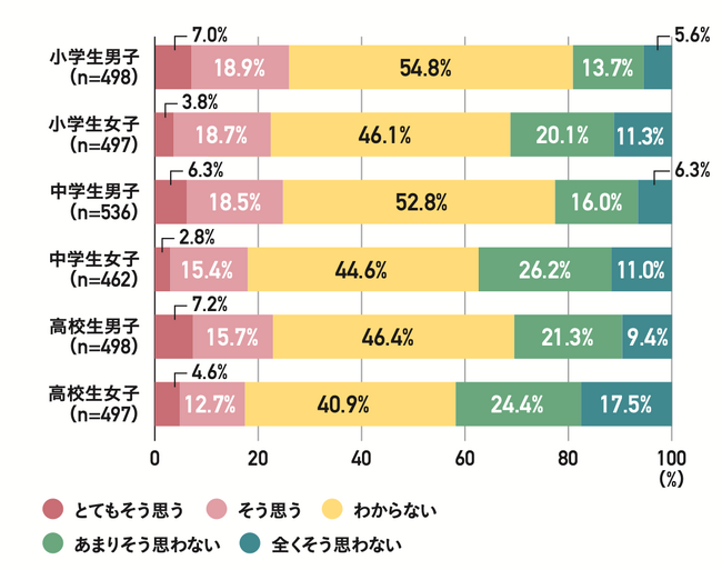 自分が将来プログラミング関連の仕事に就くと思うかという設問に対して、「とてもそう思う」「そう思う」と回答した児童・生徒は、全ての学校種において、女子よりも男子の方が高く、「あまりそう思わない」「全くそう思わない」と回答した児童・生徒は、全ての学校種において男子よりも女子の方が高いことがわかりました。