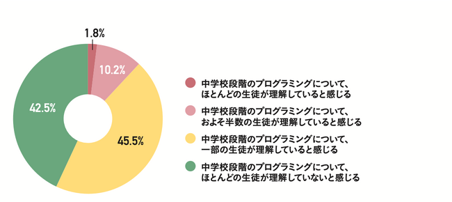 高校教員からみた、高校入学時の生徒の中学校段階におけるプログラミング教育への理解について、「ほとんどの生徒が理解していない」「一部の生徒が理解している」がそれぞれ4割超、合わせて9割近い結果になりました。