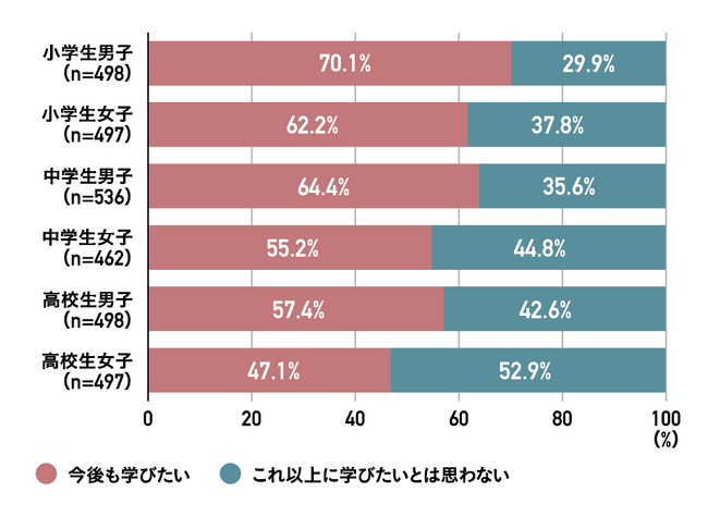 また、プログラミングの学習を継続したいかどうかに関して、「これ以上に学びたいとは思わない」と回答した割合も、全ての学校種において女子の方が高い結果となりました。特に、高校生女子は「これ以上に学びたいとは思わない」が全体の半数を超えました。