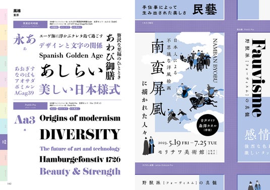 本書では、モリサワの書体一覧を「表現・特徴・全書体見本」という3つのカテゴリから探すことができます。これにより制作物に最適な書体を、3,500種類以上のMorisawa Fontsライブラリから直感的に選択することが可能です。