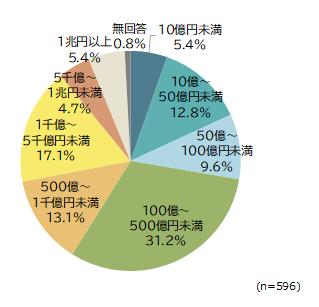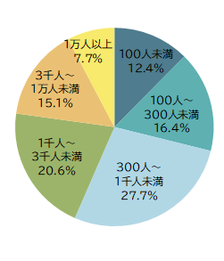 ○従業員規模別でみると、大企業は導入済の割合が高く、上記回答企業のうち約3割で導入がなされていました。中堅企業では「導入の予定はない」、中小企業は「検討していない」の割合が全体より高く、規模別で導入・検討状況に違いがみられました。