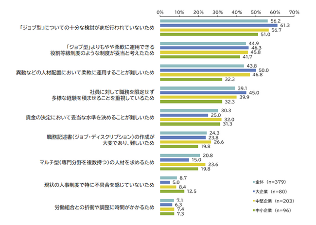 ○その他には、「ジョブ型」よりもやや柔軟に運用できる役割等級制度のような制度が妥当と考えたため」(44.9%)、「異動などの人材配置において柔軟に運用することが難しいため」(43.8%)、「社員に対して職務を限定せず多様な経験を積ませることを重視しているため」(39.1%)が理由として挙がりました。