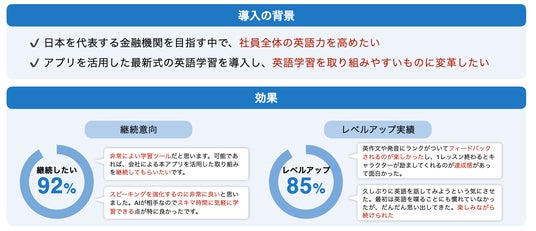 多忙で自己啓発の時間捻出が難しい社員でも、対人予約が必要な語学スクールと異なり、気軽に自宅にいながら誰にも気兼ねすることなく英会話レッスンが可能な点が最大の魅力であり、社員がAI英会話を活用することにより、英語コミュニケーション能力向上と同時に、学びの習慣化が期待できると考えています。