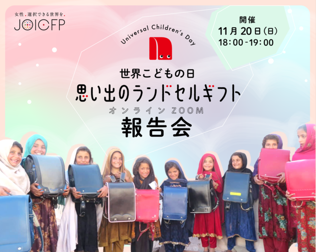 11月20日の「世界子どもの日」に際し、すべての子どもたちが、どこにいても、性別に関わらず就学の機会を得られ、生涯健康に生きられる世界を願い、ジョイセフでは「思い出のランドセルギフトオンライン報告会」を開催します。これまで寄贈をした方、これから寄贈を検討される方へ、アフガニスタンの子どもたちの様子やどのようにランドセルが贈られたのかをお伝えします。
