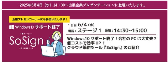 展示会初日の6月4日(水)14時30分からはステージ1にて、2025年10月のWindows10サポート終了に伴う落とし穴を解説し、新しく生まれ変わったクラウド筆耕ツール『SoSign』をご紹介いたします。