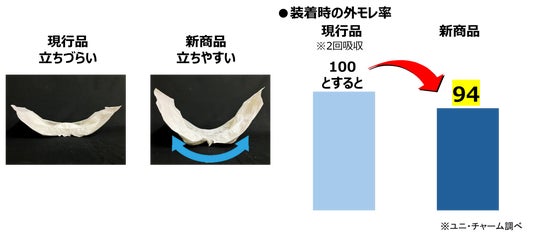 ・ギャザー部分の立ち上がり性能を改善し、モレ率を低減。より安心してお使いいただけます。