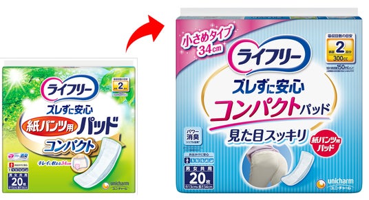 ・『ライフリー ズレずに安心 紙パンツ用パッド コンパクト』のパッケージデザインを刷新。着用した様子を写真で表現し、ズレずに安心シリーズ同様のブルーカラーを採用しました。