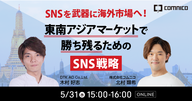 株式会社ラバブルマーケティンググループ(本社:東京都港区、代表取締役社長:林 雅之)の子会社で、企業のSNSマーケティング支援事業を行う株式会社コムニコ(本社:東京都港区、代表取締役:長谷川 直紀、以下 コムニコ)は、グループ企業の、東南アジアにおけるマーケティングや訪日外国人旅行客(インバウンド)プロモーション支援を行うDTK AD Co.,Ltd.(本社:タイ王国 バンコク、代表取締役: 木村 好志、以下DTK AD(ディーティーケー アド))と協業で、無料オンラインセミナー「SNSを武器に海外市場へ!東南アジアマーケットで勝ち残るためのSNS戦略」を、5月31日(水)15時から開催いたします。