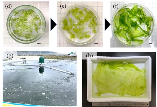 ヒトエグサの成長;細菌Bを添加して7日目(d)、14日目(e)、20日目(f)の藻体と陸前高田ベースにおける屋外水槽での養殖風景(g)、陸上養殖で約30cmに生長した個体(h)。写真(d,e,f)のスケールバーは1cmを示す。