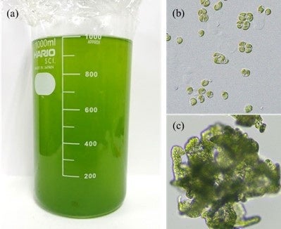 ヒトエグサの種苗生産;単細胞状態で増殖するヒトエグサ(a:培養ビーカーの外観、b :細菌Aを添加して単細胞状態で増殖)、および細菌Bを添加して葉状化した藻体(c)