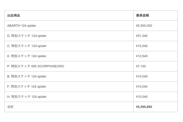 また、同時に出品されたオリジナルスケッチも、このオークションのために特別に提供されたもので、ABARTH 124 spiderがモチーフのものとABARTH 595 Scorpioneoroがモチーフのものが計16点出品され、合計¥95,890円で落札されました。こちらの落札金額も全てシャイン・オン!・キッズへの寄付となります。