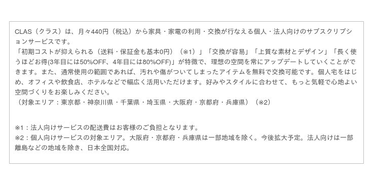 事業内容 :家具・家電のサブスクリプションサービスCLAS(クラス)の運営