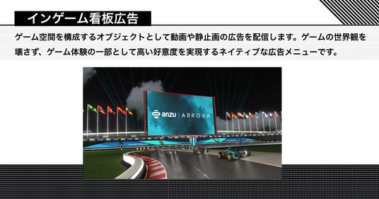 ゲーム空間を構築するオブジェクトとして、空間に組み込む画像・動画広告フォーマットです。広告枠がゲーム内に自然に設置されることによって、コンテンツのリアリティが向上する効果もあります。