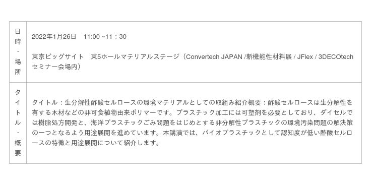 また、同会場のマテリアルステージ(東5ホール)で実施されるセミナーで、「生分解性酢酸セルロースの環境マテリアルとしての取組み紹介」と題した講演を行います。海洋プラスチックごみ問題をはじめとする非分解性プラスチックの環境汚染問題の解決策の一つとなるよう用途展開を進めている実情をご説明します。