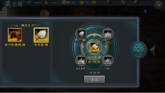 指定の至宝四つと隕鉄を合成することによって、UR至宝をMR至宝に昇品(品質を向上すること)し、その至宝効果は専用武将のスキル効果を更なる強大なスキルへ変化させます。