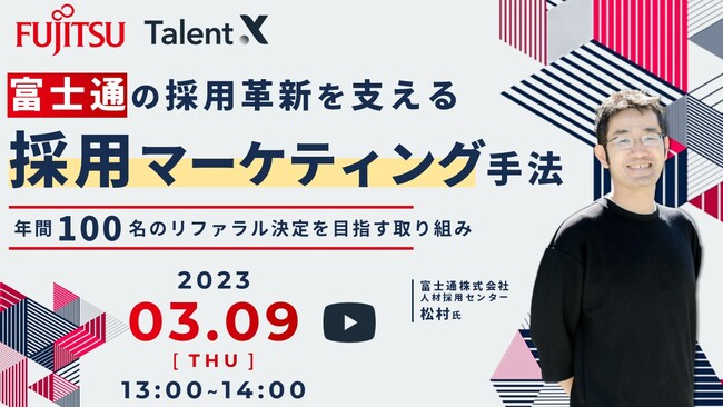 株式会社TalentX(本社:東京都新宿区、代表取締役CEO:鈴木貴史)は、富士通株式会社をゲストにお招きして、「富士通の採用革新を支える採用マーケティングとリファラル採用」をテーマにお話しいただくオンラインセミナーを3月9日(木)に開催いたします。