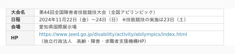 全国アビリンピックは、障害のある方々が日頃職場などで培った技能を競い合い、その職業能力の向上を図るとともに、企業や社会一般の人々に障害のある方々に対する理解と認識を深めてもらい、その雇用の促進を図ることを目的として開催されています。