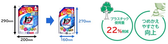 今回のリニューアルで、2商品の「つめかえ用超特大」(900g)のパッケージフィルムサイズを縮小(幅200×高さ290×奥行120mm→幅160×高さ270×奥行90mm)することで、以下を実現いたしました。