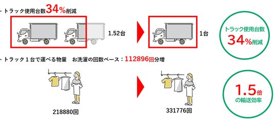 2.商品輸送に使用する段ボールサイズが縮小でき、段ボール使用量削減、トラック輸送時の輸送効率1.5倍向上、トラック使用台数34%削減