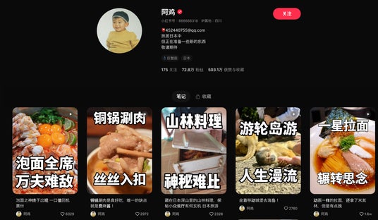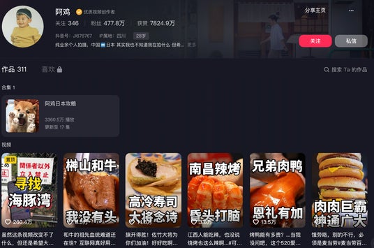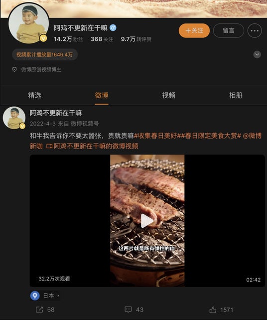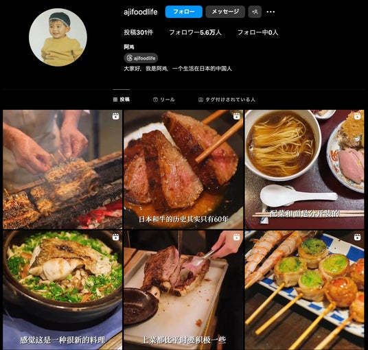 「阿鶏」は東京在住の中国人インフルエンサーです。抖音(Douyin)では477.8万人、小紅書(RED)72.8万人のフォロワーを持ち、主に日本の「グルメ」「観光・旅行」「文化」などのジャンルにおいて発信を行っており、またこれまでに数多くのPR実績があります。彼のフォロワーの年齢層は幅広く、20代~40代までになっています。