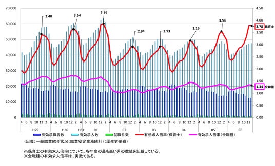 出典:こども家庭庁公表「保育士の有効求人倍率の推移(全国)」令和7年1月