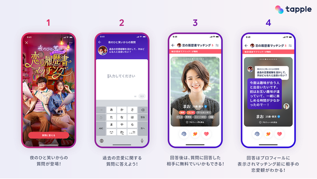 株式会社タップル(本社:東京都渋谷区、代表取締役社長:飯塚勇太)は、提供するマッチングアプリ「タップル」において、質問に答えることでパーソナリティがわかる新機能をリリースしたとともに、6月12日(月)~8月の期間で人気YouTuber・夜のひと笑いとのコラボコンテンツ「恋の履歴書マッチング」の提供を開始することをお知らせいたします。