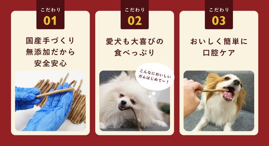 愛犬の健康のためにデンタルケアは欠かせない一方で、多くの飼い主さまが、歯磨きや口腔ケアを嫌がる愛犬に苦労しています。また、デンタルガムに含まれる添加物を不安視する声もあります。そこで、多くの飼い主さまの悩みである「愛犬の歯磨き」を、無添加で安全安心な自然由来の素材を使い、その上食べっぷりが良い商品を提供することで課題を解決したいと考え、この度ワンちゃん用のデンタルガム「本州鹿の手づくり鹿皮ガム」を開発しました。