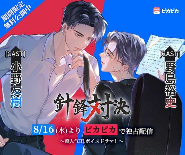 中国の人気作家である水千丞氏によるオリジナルBL作品『針鋒対決 シーズン1』が、人気声優の小野友樹氏と野島裕史氏を主役に迎えた日本語版のボイスドラマとして、2023年8月16日(水)より、夢の光株式会社(本社:東京都港区、代表:顧)の運営する音声コミュニティーアプリ「ピカピカ」で配信を開始します。