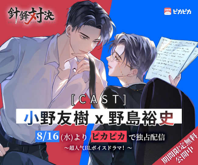 中国の人気作家である水千丞氏によるオリジナルBL作品『針鋒対決(しんほうたいけつ)(英語作品名:Beloved Enemy)シーズン1』(以下は『針鋒』と略する)が、人気声優の小野友樹氏と野島裕史氏を主役に迎えた日本語版のボイスドラマとして、2023年8月16日(水)より、夢の光株式会社(本社:東京都港区、代表:顧)の運営する音声コミュニティーアプリ「ピカピカ」で配信を開始します。